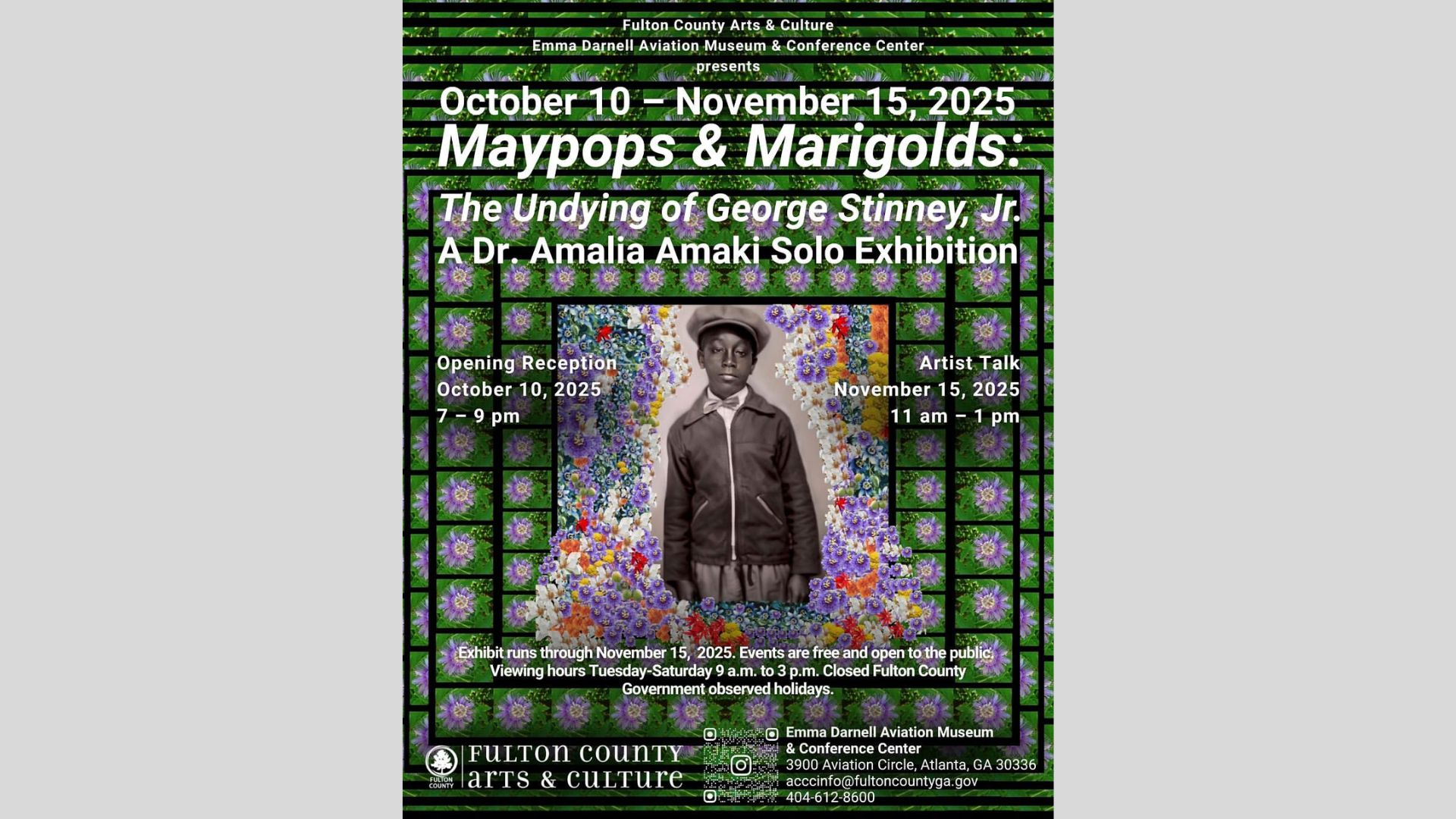 Fulton County, Georgia – Fulton County Arts & Culture is inviting everyone to see a highly affecting display called “Maypops and Marigolds: The Undying of George Stinney, Jr.” It is a solo show by the famous artist and art historian Dr. Amalia Amaki. The Emma Darnell Aviation Museum and Conference Center is hosting the show, which is based on more than 20 years of research and imaginative interpretation of one of the most disturbing stories in American history.